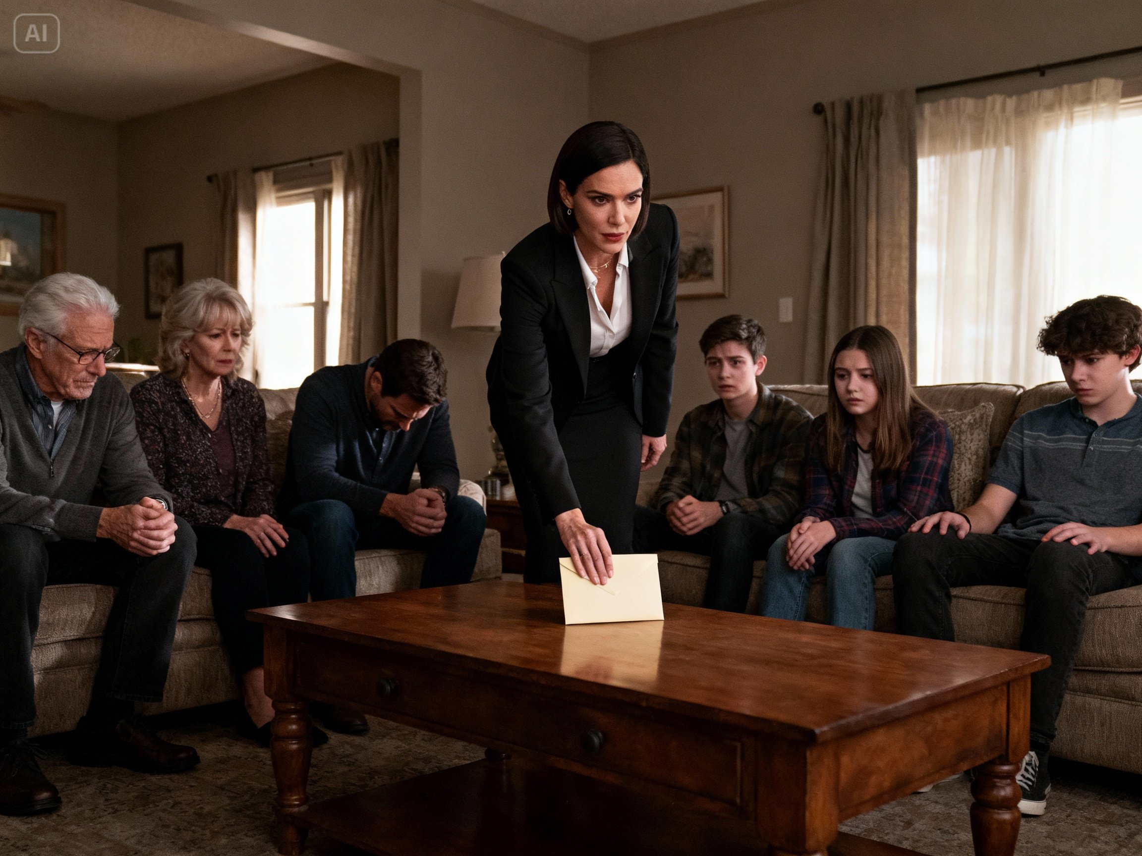 I placed the envelope on the oak coffee table. The room went dead silent.
