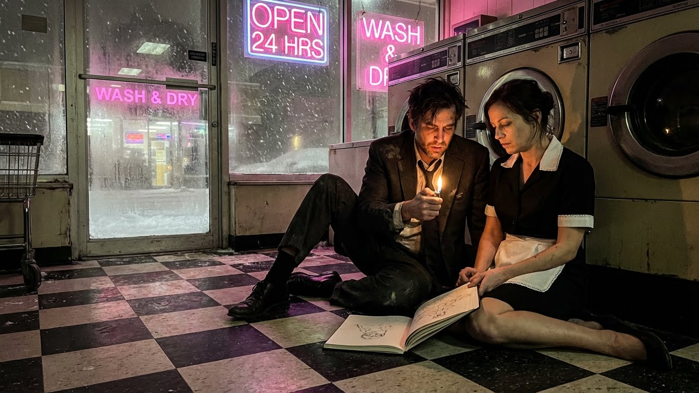 They sat on the linoleum floor, their backs resting against the industrial dryer that still held a ghost of warmth. The silver Zippo lighter sat between them on the floor, its small flame standing straight and steady, a tiny lighthouse in a sea of shadows.