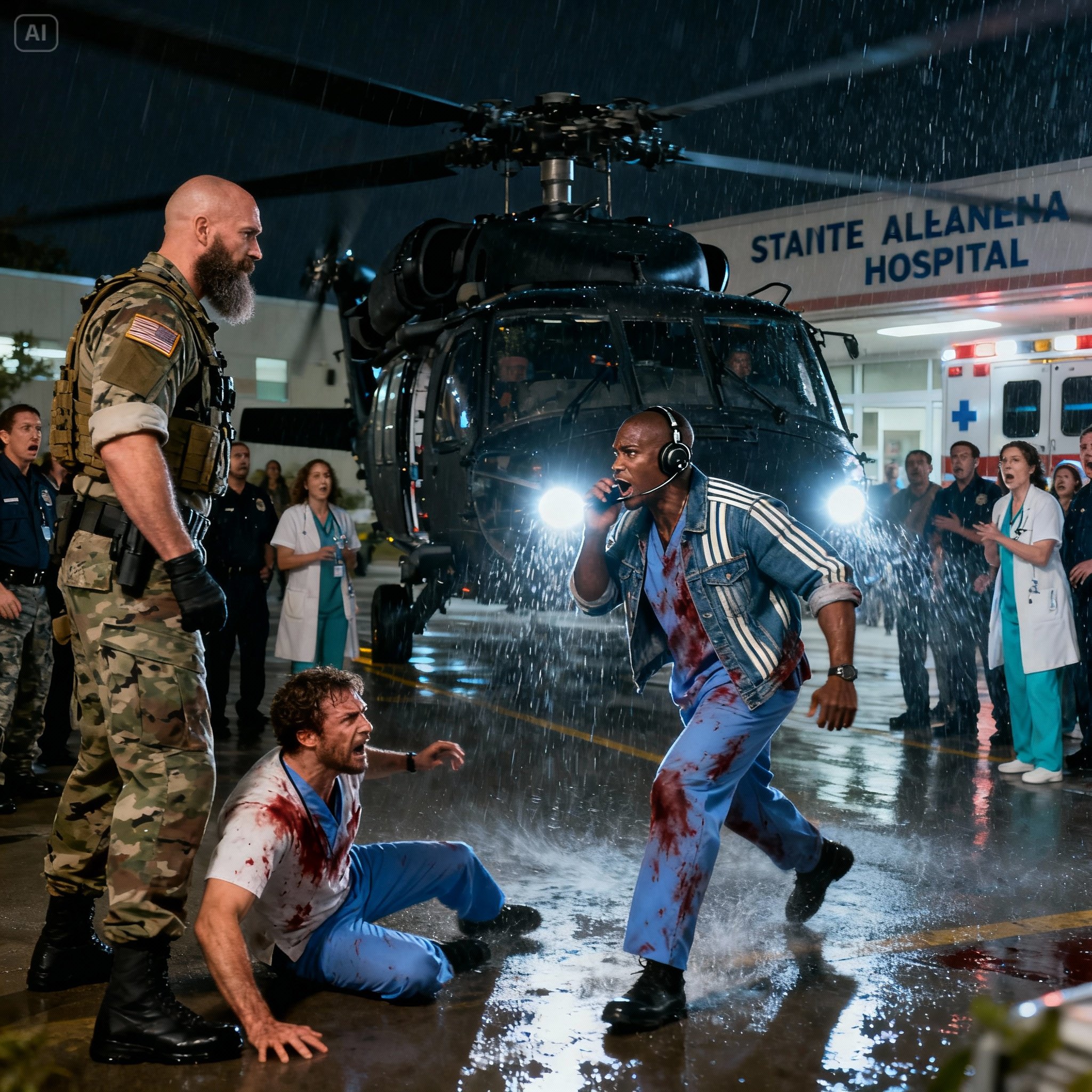 De repente, o céu noturno foi rasgado por um holofote branco cegante. O vento com força de vendaval vindo dos rotores agitou a chuva em um frenesi, fazendo latas de lixo deslizarem pelo asfalto e forçando os pedestres a protegerem os olhos. Um enorme helicóptero UH-60 Blackhawk, pintado em preto fosco furtivo, fez uma manobra agressiva e pousou com força bem no meio da área de retorno das ambulâncias, bloqueando a entrada.