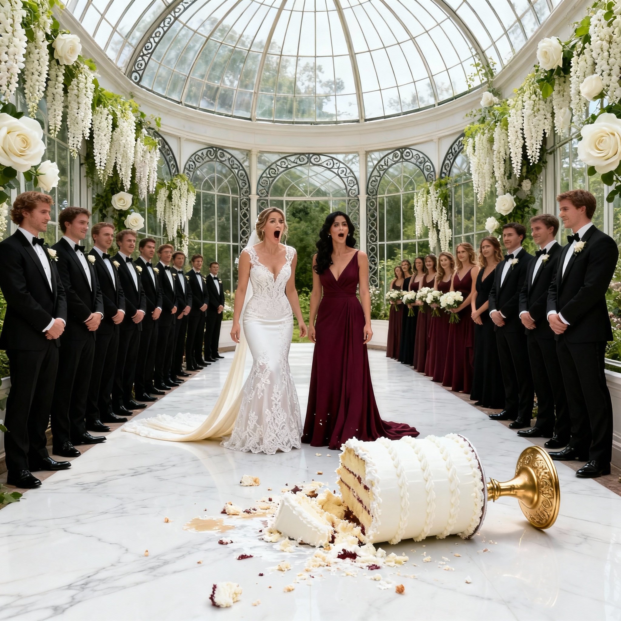 O som foi cataclísmico. A torre de sete andares oscilou por uma fração de segundo e desabou violentamente sobre o chão de mármore. A porcelana estilhaçou-se. Camadas de pão de ló, ganache e creme explodiram para fora como uma granada doce, atingindo os convidados da primeira fila.