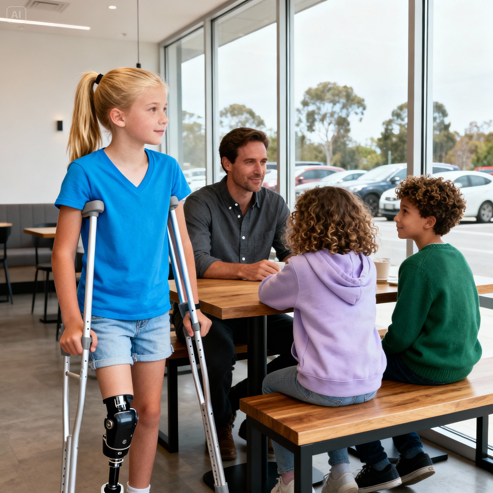 Em meio ao caos de lattes fumegantes, baristas gritando nomes e profissionais digitando furiosamente em seus laptops, ninguém parecia notar a menina parada logo na entrada, no vestíbulo. Ela se equilibrava desajeitadamente, transferindo o peso de forma pesada e irregular para um par de muletas de alumínio que tremiam levemente no piso de ladrilho escorregadio. Ela examinava o salão com olhos desesperados, procurando um pedaço de espaço, um canto qualquer naquela sala lotada.