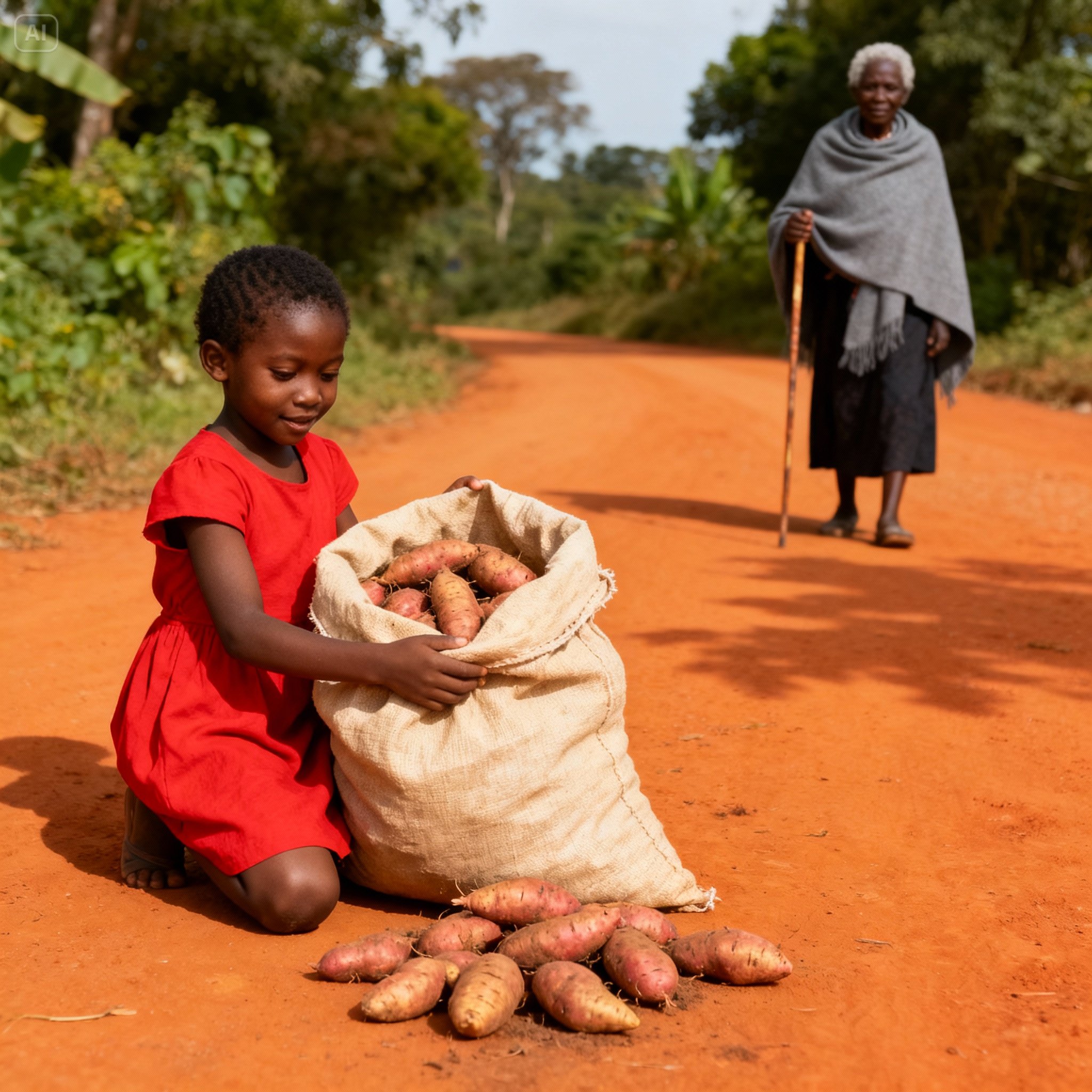 Seu dedo do pé prendeu em uma raiz submersa na margem da estrada. Não houve tempo para se segurar. O peso do saco a impulsionou para frente. Ela atingiu o chão com força, o cascalho rasgando seu jeans e mordendo seus joelhos. O saco se abriu, derramando grãos dourados na lama e na poeira.