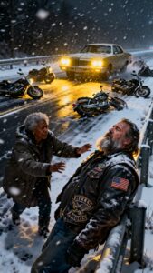 My blood ran cold, and it wasn’t from the weather. Everyone knew the stories. Everyone knew the reputation. These were outlaws. Criminals. The kind of men you crossed the street to avoid in broad daylight, let alone on a deserted highway in the middle of a blizzard.