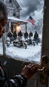 I stood behind the frosted glass of my front door, my breath hitching in a throat that felt like it was filled with broken glass. Outside, the world had disappeared into a swirling vortex of white, but through the haze, I saw them. Nine of them. Nine massive, leather-clad giants who had emerged from the snow like phantoms. They weren’t just men; they were mountains of black leather and chrome, their beards caked in ice, their eyes desperate and wild. I watched as their motorcycles—huge, roaring beasts that usually shook the pavement—disappeared under the drifts, rendered useless by the storm.
