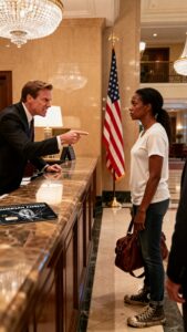 “To what?” the man challenged. “Stand here in the lobby of a public hotel? I’m a guest here too, Officer. Room 2847. Been staying here for three days on business.” He flashed his key card. “And in three days, this is the most disgusting display of racism I’ve witnessed in this establishment.”