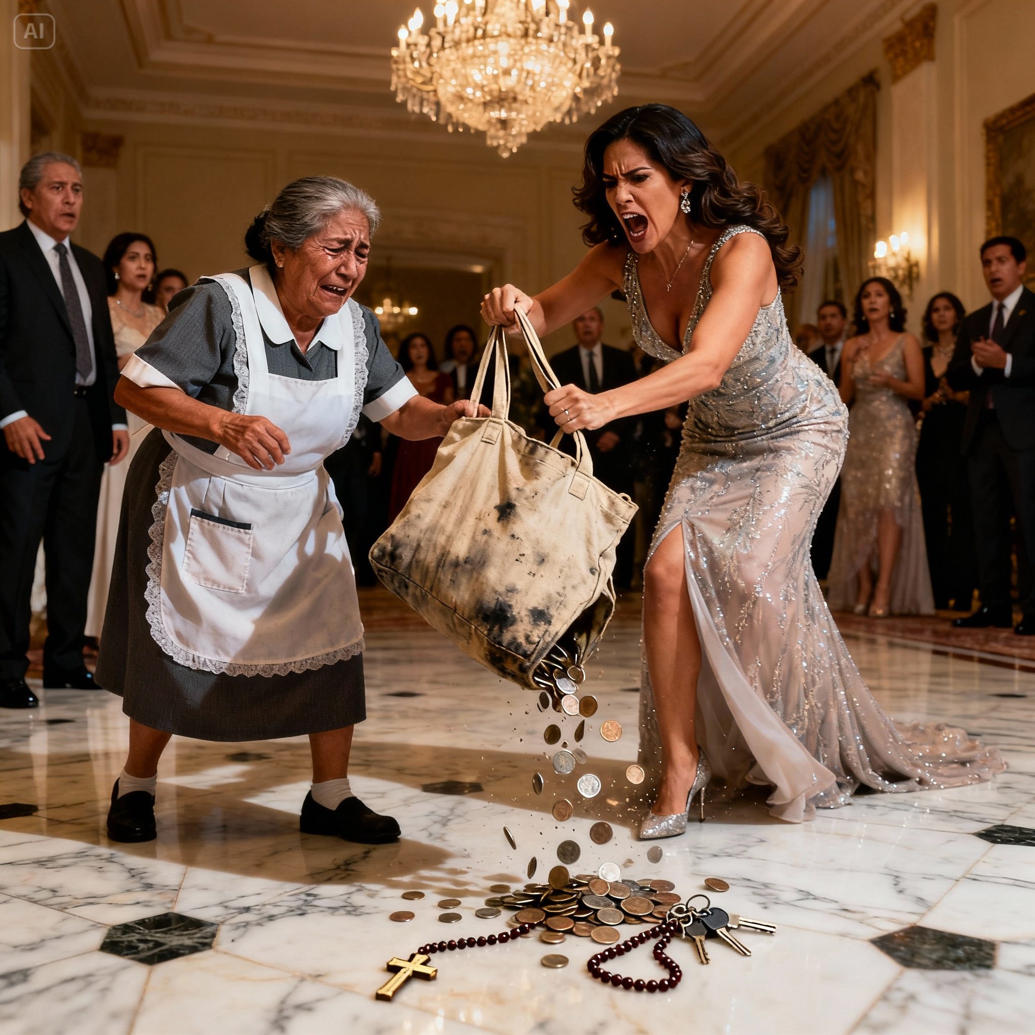 Todos estiraron el cuello para ver el botín. Esperaban ver el destello verde de la esmeralda. Pero lo que vieron fue la pobreza desnuda de Carmen expuesta bajo mis candelabros de cristal. Un monedero de plástico roto. Unas monedas sueltas que no sumaban ni cincuenta pesos. Un tupper vacío que aún olía a la comida que yo le había permitido llevarse. Unas llaves con un llavero de San Judas Tadeo. Un peine sin dientes. Y pastillas para la presión sueltas, envueltas en una servilleta.