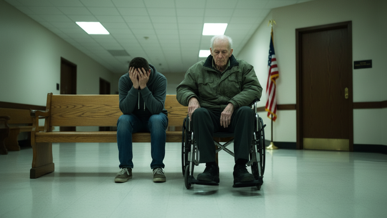 His hand was trembling on the rubber wheel of the chair, but his grip was firm. The brake clicked into place, a sharp sound that echoed off the high marble walls of the courtroom.