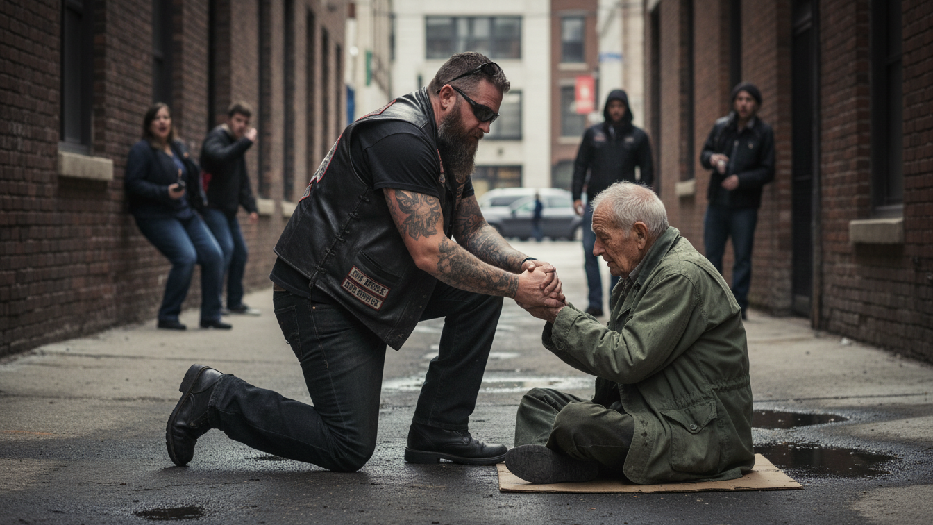 The dynamic on the street shifted instantly. When one biker stops, it’s a curiosity. When twenty stop, and four of them are standing in a tactical circle around a homeless man, it’s a statement.