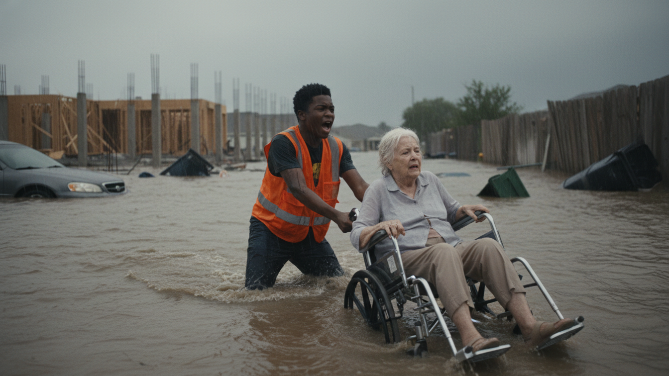 An elderly white woman sat in it. She was gripping the armrests so hard her knuckles were white. She looked small, terrified, and completely alone. The water was rising fast, pushing her toward the massive drainage canal near the underpass. If she went into that tunnel, she was gone.