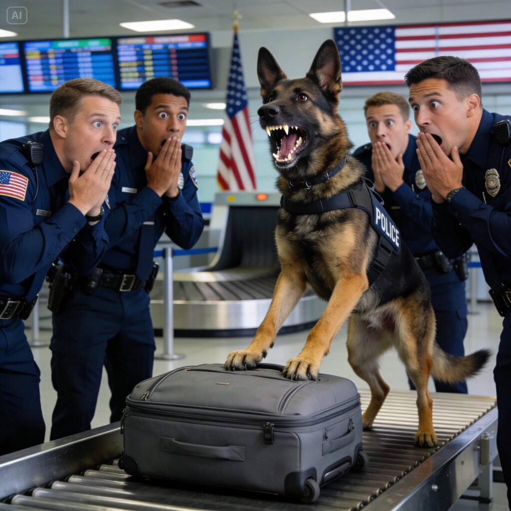 She reached secondary screening at 7:58 a.m. The first thing she saw was the dog. Frost stood beside the examination table, four legs planted, ears forward, eyes fixed on the gray suitcase with an intensity that made Laura’s breath catch. His handler was crouched beside him, one hand on the dog’s back, speaking softly. But the dog wasn’t listening. The dog wasn’t looking at anything except that suitcase.