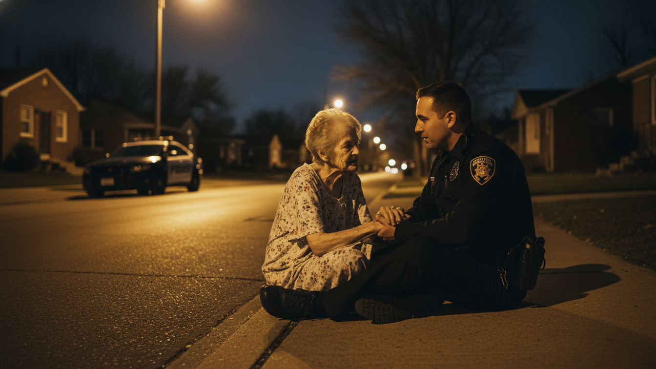 She took a step back, tripping slightly over the curb. “No, no police. No trouble. I’m a good girl. I just… I want to go home.” Tears began to stream down her wrinkled cheeks, illuminated by the harsh streetlamp.