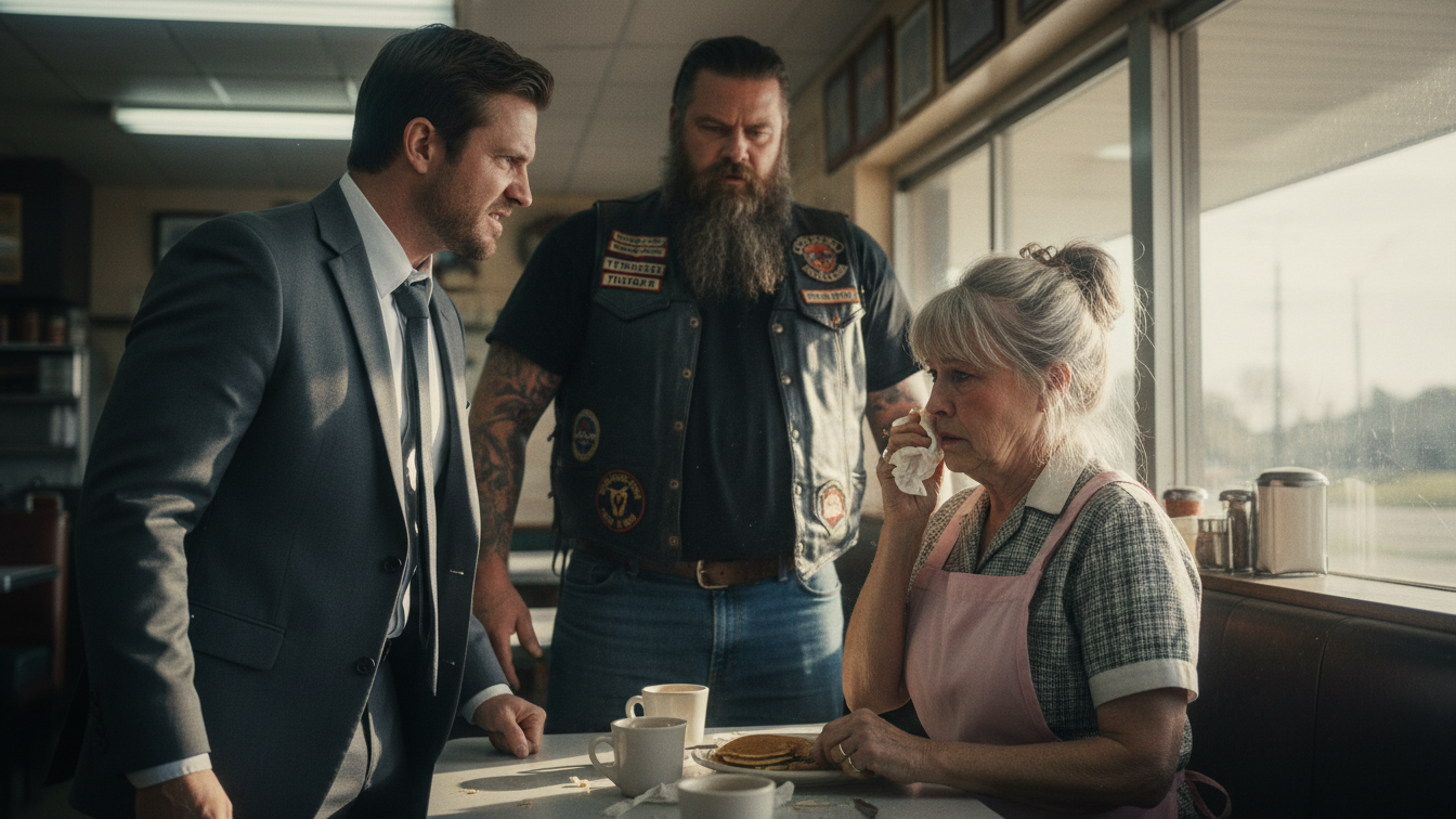 It was a sound that seemed to echo louder than Leonard’s shouting. Then the man next to him stood up. Then the next. One by one, ten massive figures rose from the booth like a storm assembling itself, piece by piece. They didn’t say a word. They didn’t shout. They just stared at Leonard with a coldness that made the temperature in the diner drop ten degrees.