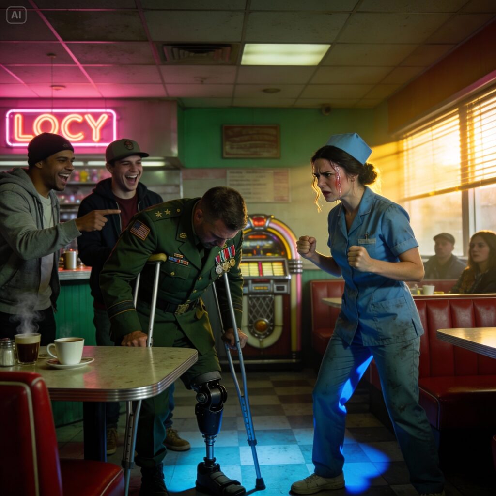 Walking down the aisle was a man moving slowly, carefully. He was on crutches. Below the hem of his jeans, the metal rods of a prosthetic leg caught the morning sun. He was younger than me, maybe late twenties, but he carried himself with a rigid, quiet dignity that screamed “veteran.” He was just trying to get to a table.