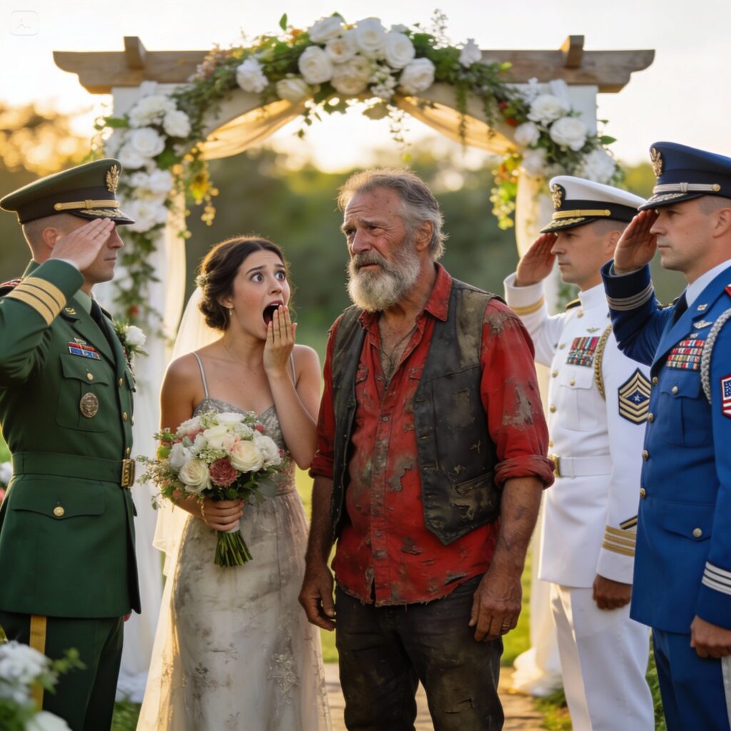 He was a wreck. His clothes were torn rags, his face was hidden beneath layers of grime and an unkempt grey beard. The smell hit me from ten feet away—rain, exhaustion, and the streets. He didn’t belong there, surrounded by polished luxury cars and officers in immaculate dress blues.