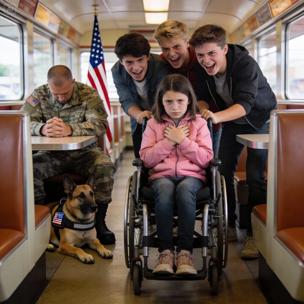 The boy—the one who had kicked the chair—froze. His foot was still half-extended. He looked down, and suddenly, his view of the vulnerable little girl was blocked by the broad, dark chest and unblinking stare of a combat dog.