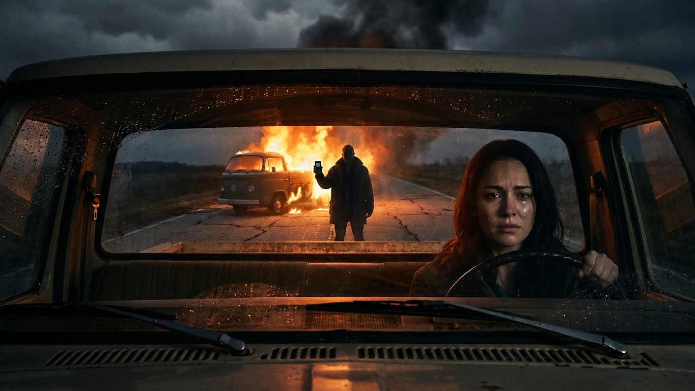 The heat from the burning van distorted the air, making Arthur Carter look like a flickering demon in the middle of the highway. The smell was horrific—melting rubber, ancient upholstery, and the acrid tang of burning chemicals. That van had been my home, my sanctuary, and my husband’s last gift. Watching it burn felt like watching Elias die all over again.