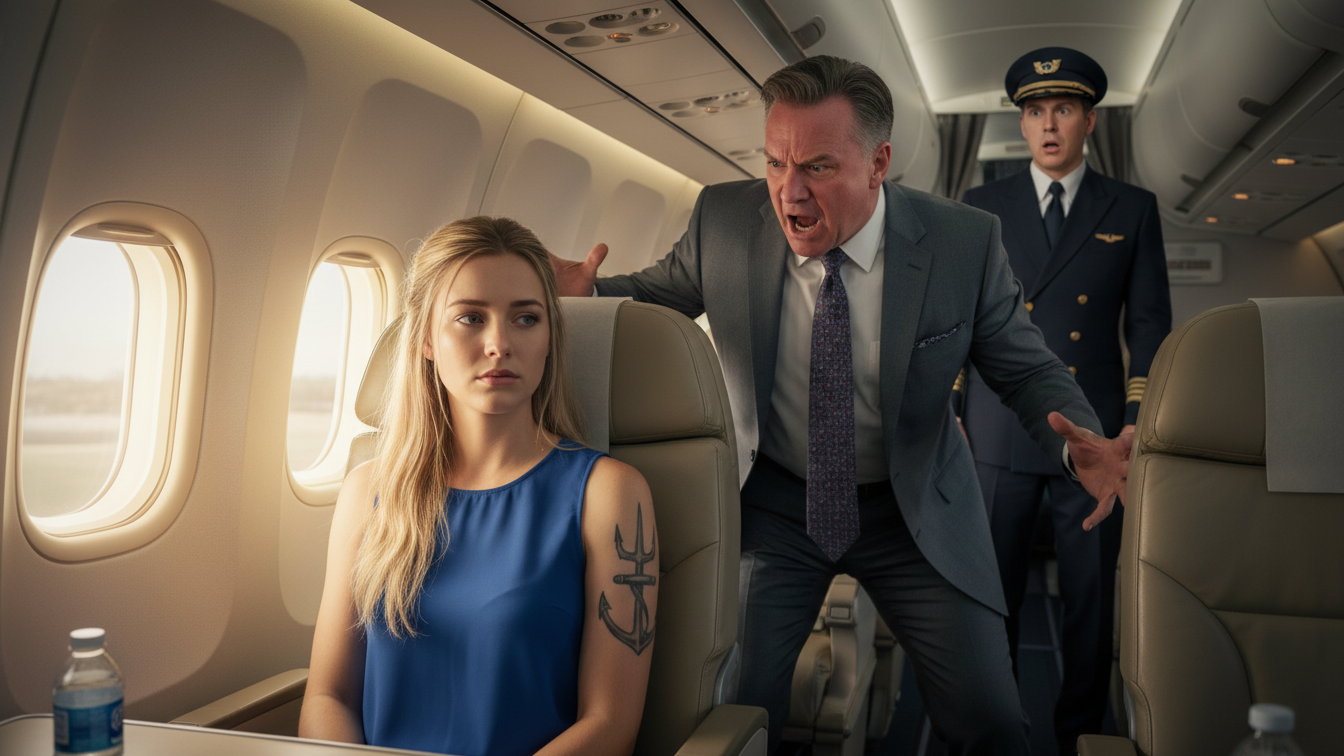 I adjusted the hem of my royal blue sleeveless top, letting my long blonde hair cascade over my left shoulder, and slowly turned my gaze toward the aisle. A man in a bespoke charcoal suit loomed over me. He was holding a tumbler of scotch in one hand and a boarding pass in the other, tapping it impatiently against his thigh.