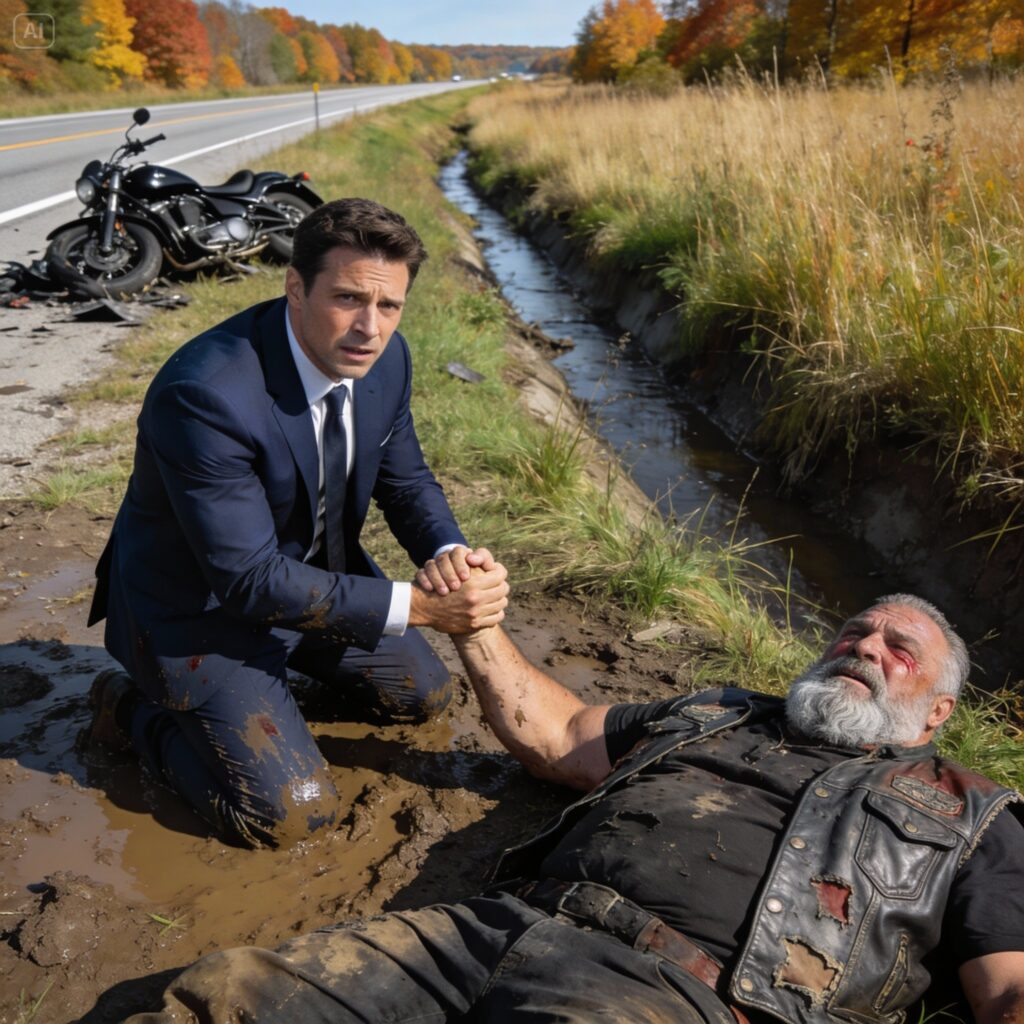 “Sir? Sir, can you hear me?” I dropped to my knees, the wet mud of the ditch instantly soaking through my expensive suit pants.