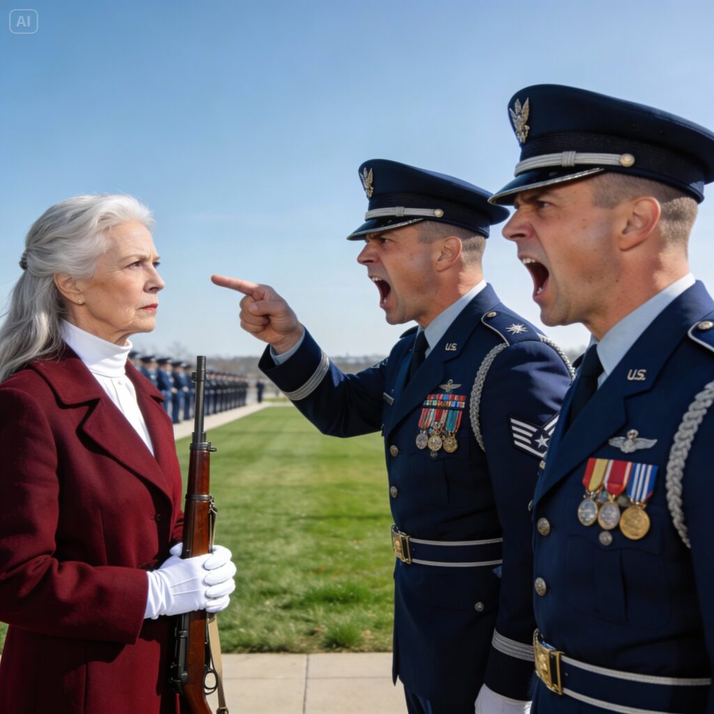 The woman in the red tweed jacket hadn’t just picked up the rifle. She had executed a “High Port” recovery with a ferocity that I had never seen before—not in basic training, not in AIT, and certainly not from the terrified privates in my detail. The barrel was angled perfectly across her body, clearing my outstretched grasping hand by less than an inch. If I had been a fraction of a second faster, the steel would have shattered my fingers.
