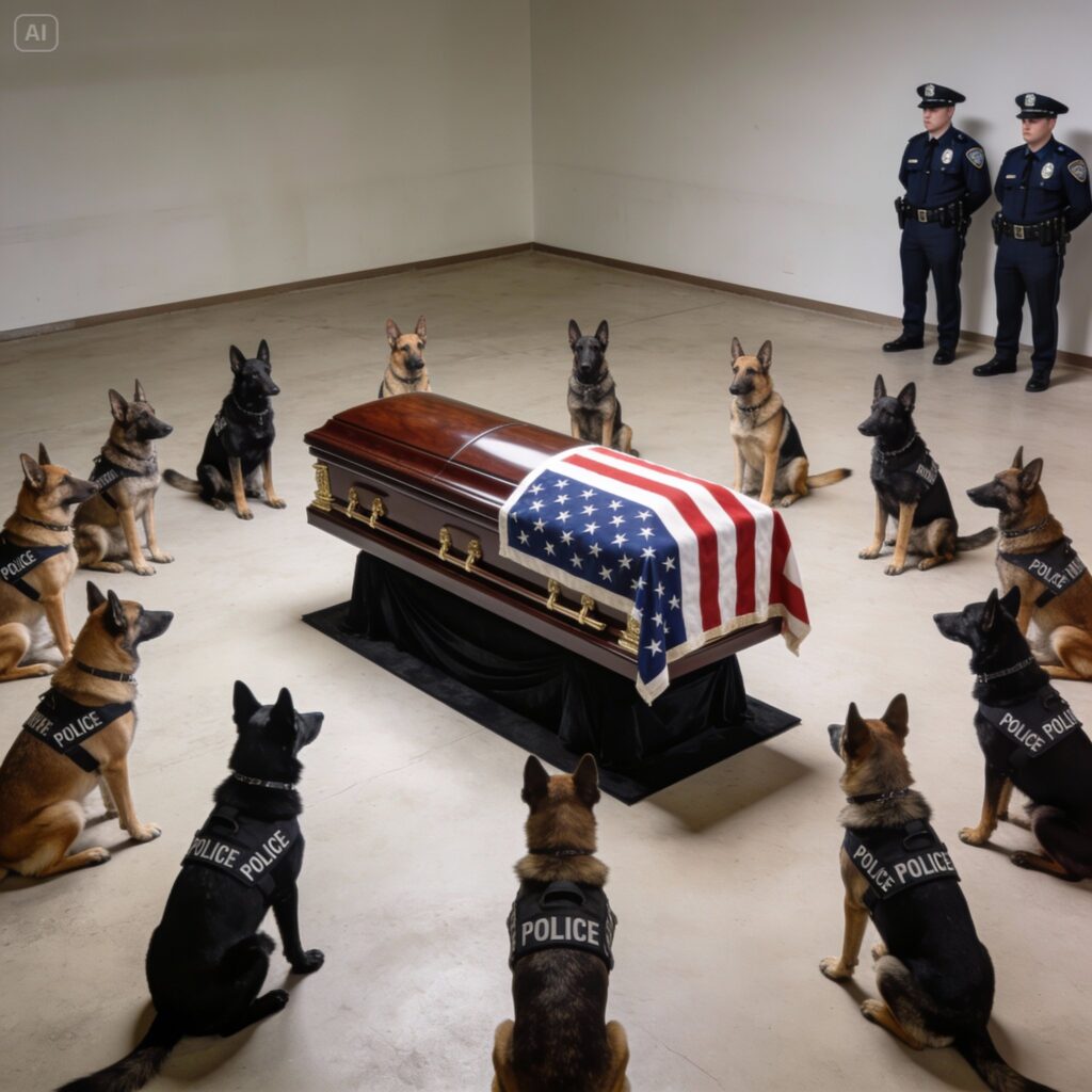 There they were, a perfect, immovable circle of Belgian Malinois and German Shepherds surrounding the flag-draped casket in the center of the room. Not a single one moved.
