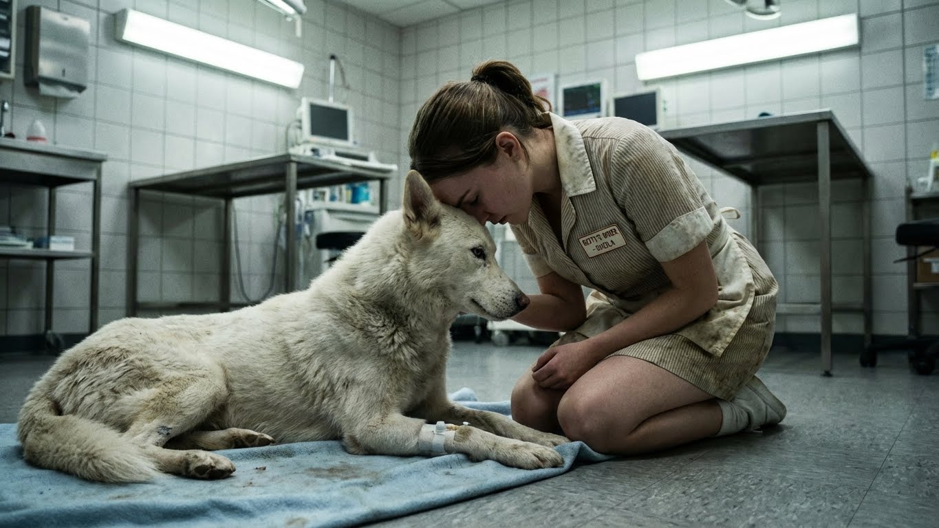 His white fur was stained yellow and brown from living in his own filth. The IV line was taped to a shaved patch on his front leg, which looked no thicker than a broomstick. His ribs didn’t just show; they looked like a cage trying to burst out of his skin. But it was his face that broke me. Even in sleep, his brow was furrowed, as if he were waiting for the next blow. There were scars across his snout—old ones, new ones—telling a story of violence I didn’t want to imagine.