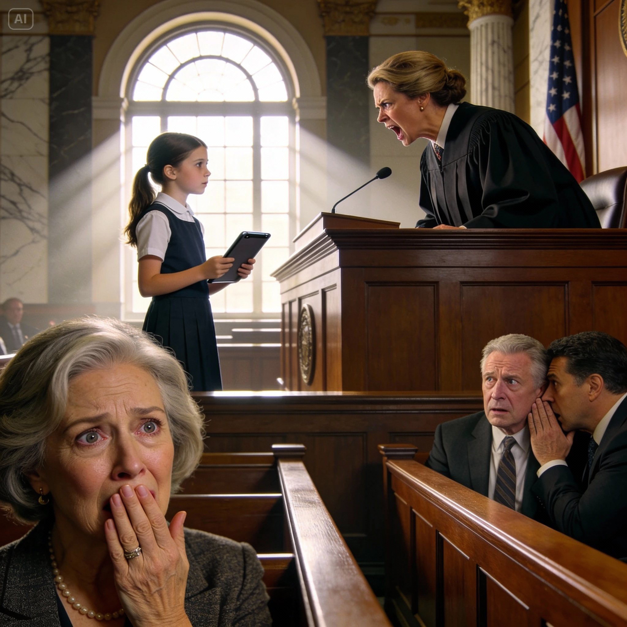 The voice was small but clear, carrying from the public gallery behind me. It was a voice I knew better than my own heartbeat. I turned, my neck cricking in protest, and my breath caught in my throat. There she was. My granddaughter, twelve-year-old Lily, standing tall between the rows of spectators, her dark hair falling around a face that held both my daughter’s determination and my own blue eyes. In her hands, she clutched an old, scuffed tablet—her mother’s, one I’d given her for games and homework.