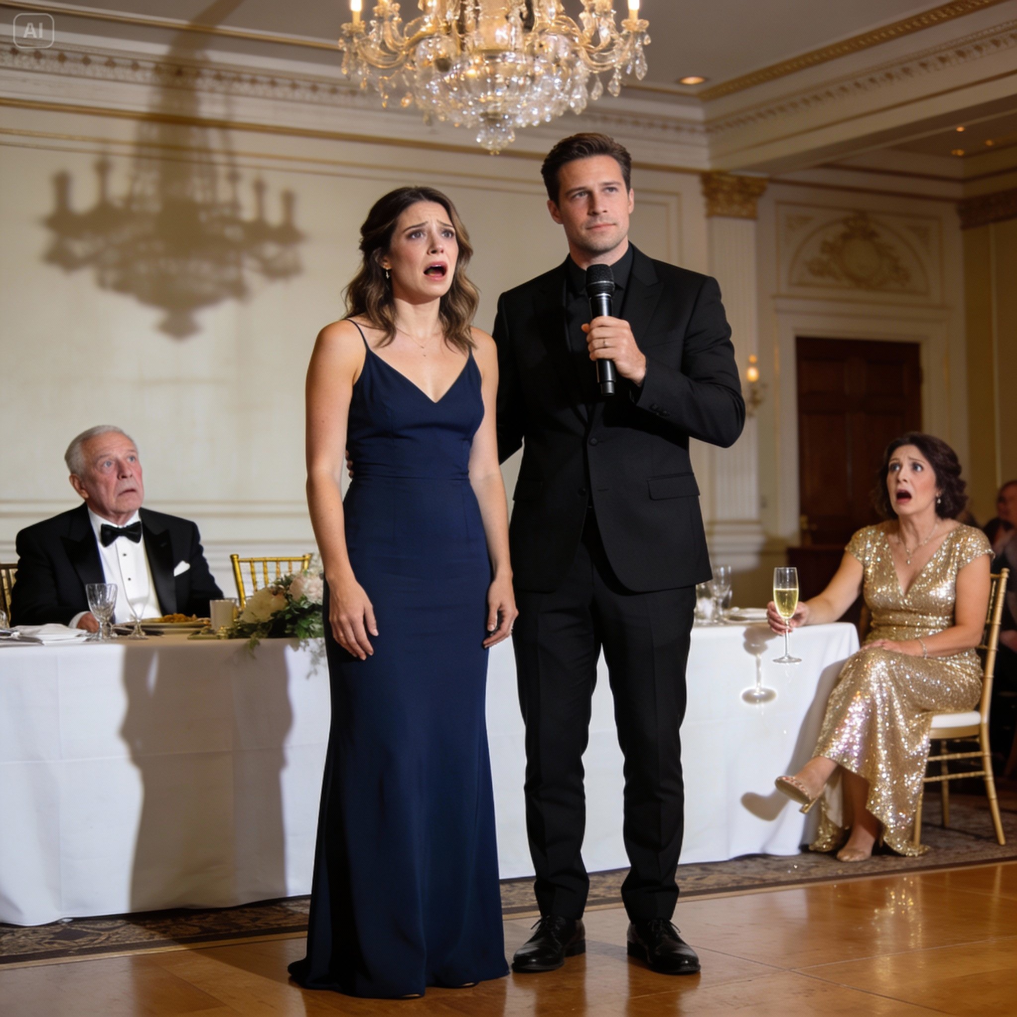Ethan returned to the microphone one last time, his presence now commanding absolute, undivided attention from every person in the stunned ballroom. The air, which moments before had crackled with chaos and confrontation, was now thick with a heavy, expectant silence.