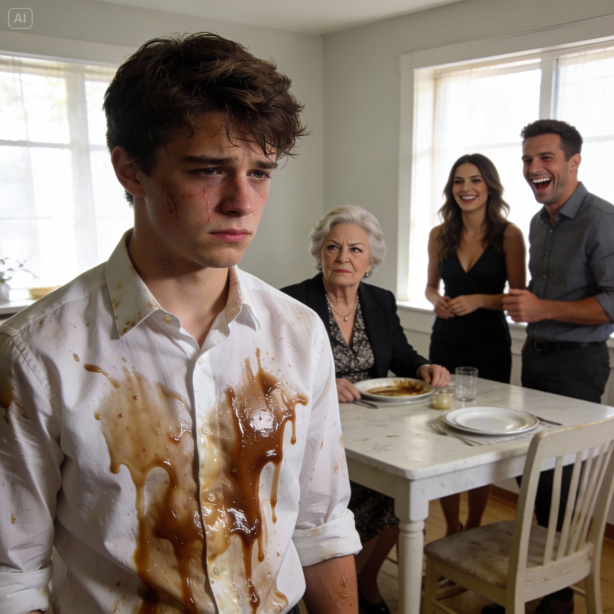 The dirty dishwater hit me before I even registered what was happening. It splattered across my white dress shirt in grotesque arcs—lukewarm, greasy, reeking of yesterday’s garbage.