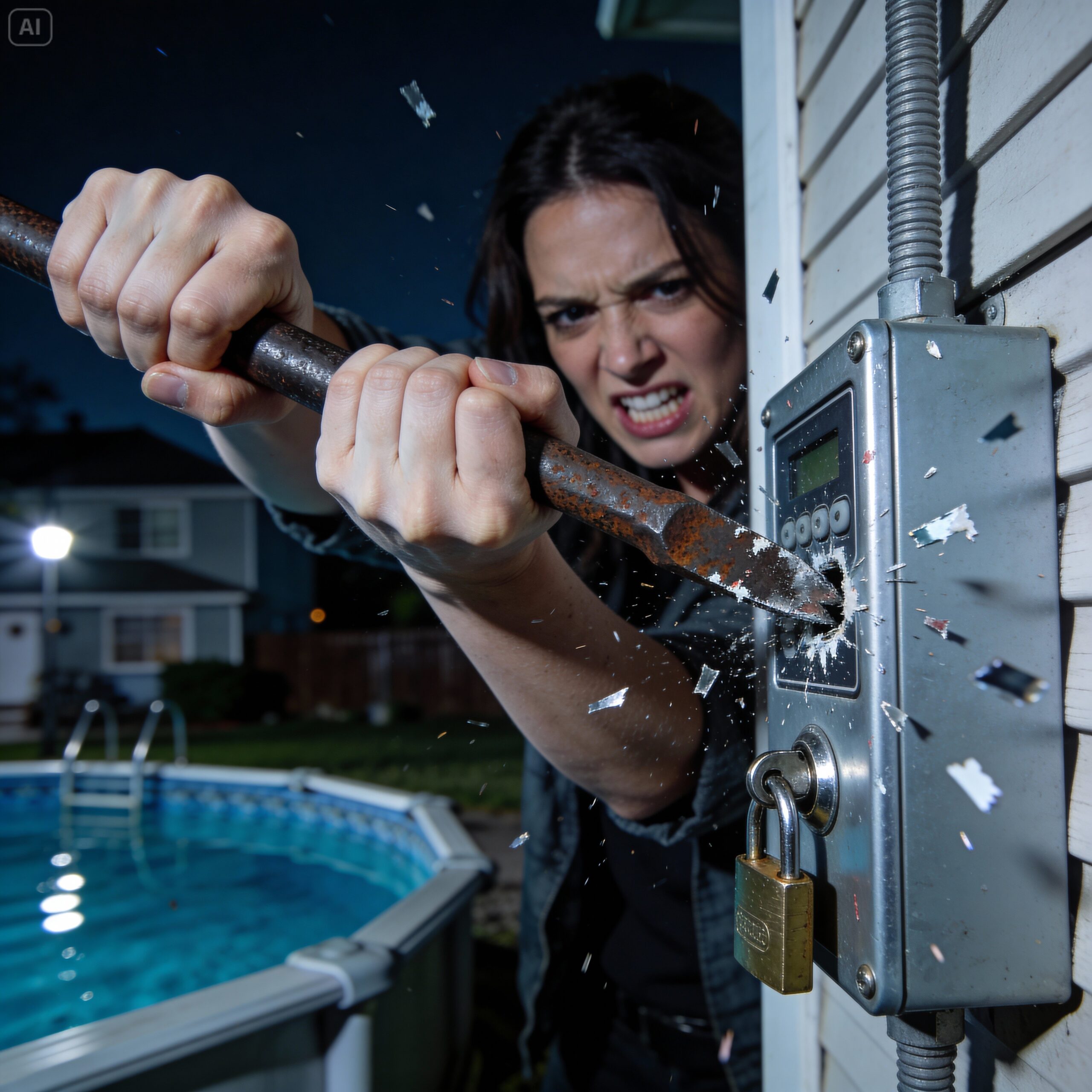 Karen emerged from the shadows of her own yard. She looked left and right, then walked confidently onto our patio. She had the crowbar again. It took her almost ten minutes of grunting and straining, the screech of metal on metal echoing faintly, but she finally broke the lock. With a triumphant groan, she keyed in the code and the pool cover began its slow, whirring retraction, revealing the shimmering, moonlit water.