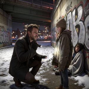 He stepped forward, his flashlight cutting through the sleet. The older child sat up, shielding the smaller one. “Who’s there?” she called out, her voice trembling but fierce. “It’s okay,” Ethan said, dropping to his knees in the mud. “I’m Ethan. You found my wallet.” Ella’s eyes widened. She tried to scramble back. “I’m sorry! I didn’t mean to—” “No,” Ethan interrupted gently. “I’m not here to take it back. I’m here to help.” Beside her, Sam coughed—a wet, rattling sound that tore through the noise of the storm. Ethan touched the boy’s forehead; he was burning up. “He needs a doctor, Ella. Now.”