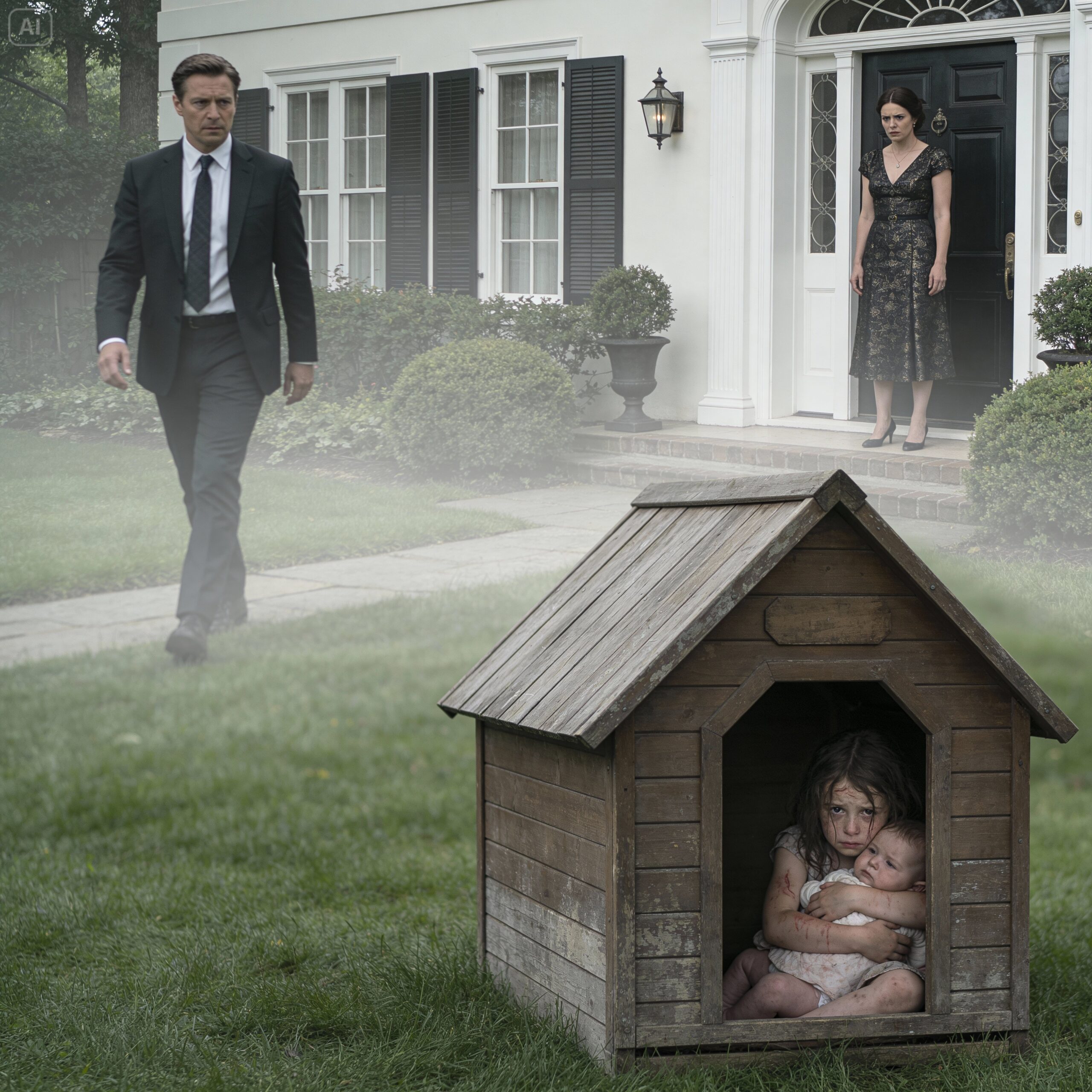 Sam let out a wail then, a cracked, hoarse sound that tore through the evening. Lily didn’t cry. She just shook. She buried her face in my neck, her small hands gripping my shirt collar so tight her knuckles turned white. She smelled like sweat and fear and the musty dampness of the doghouse.