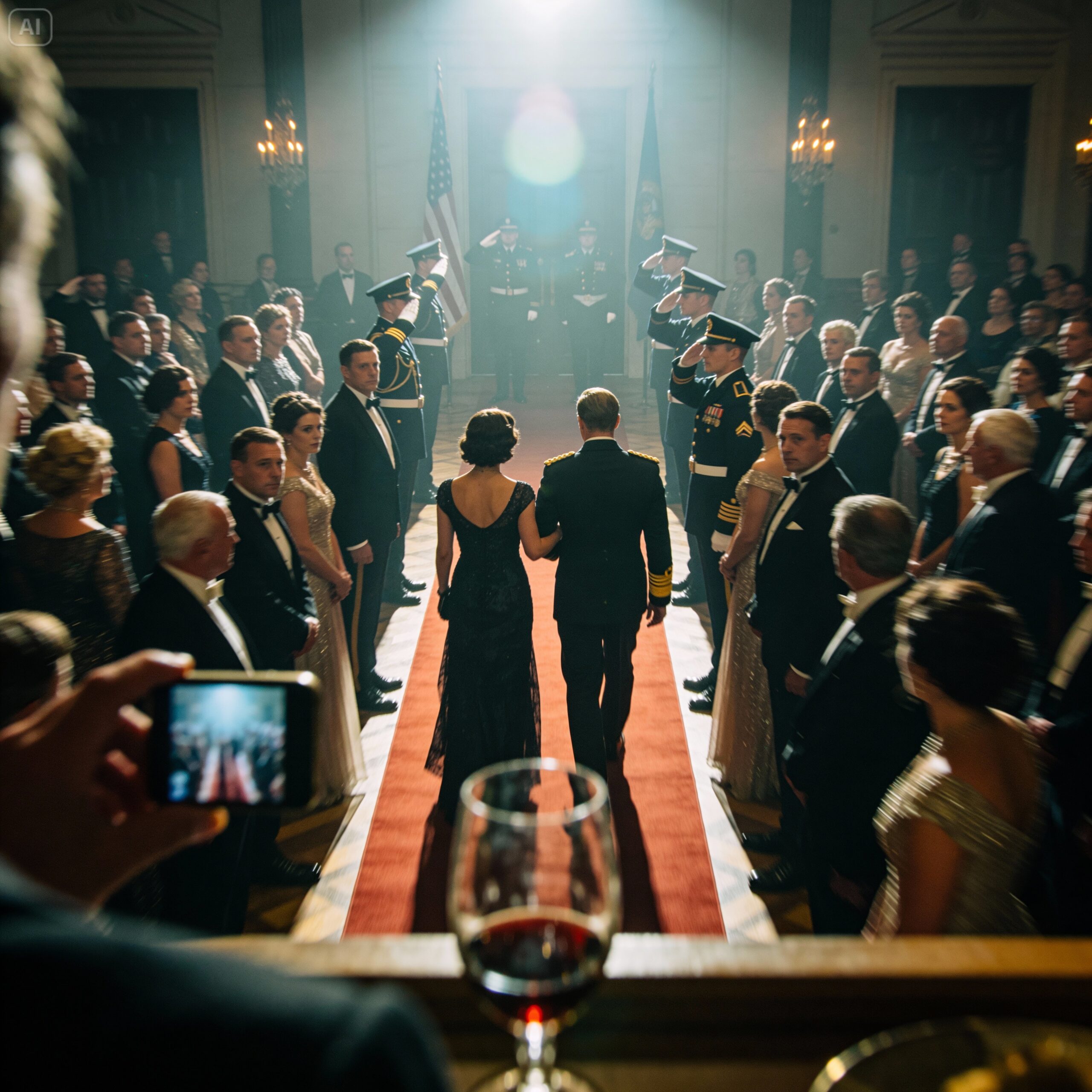 We stood just outside the ballroom of a downtown hotel, crystal lights glowing behind thick glass doors. Inside, suits and uniforms moved easily, laughing, shaking hands, belonging.