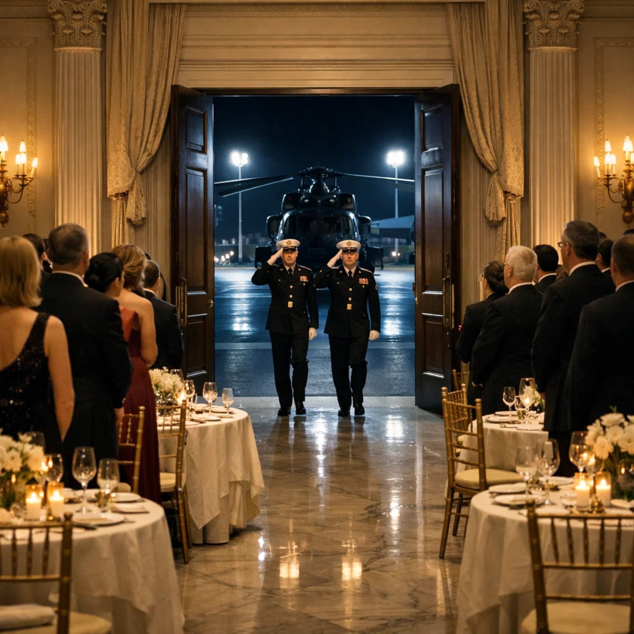 The rotor wash had scattered napkins and flower petals across the grass. The string quartet, sensing the absolute shift in atmosphere, had stopped playing mid-measure. Two hundred guests stood frozen, staring at the empty patch of sky where the black machine had vanished.