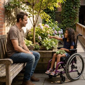 Lucas had kept his word. The kitchen counters were low enough for a wheelchair user to chop vegetables. There were no rugs to catch wheels on. And in the backyard, he had built a smooth concrete path that wound through the garden like a race track.