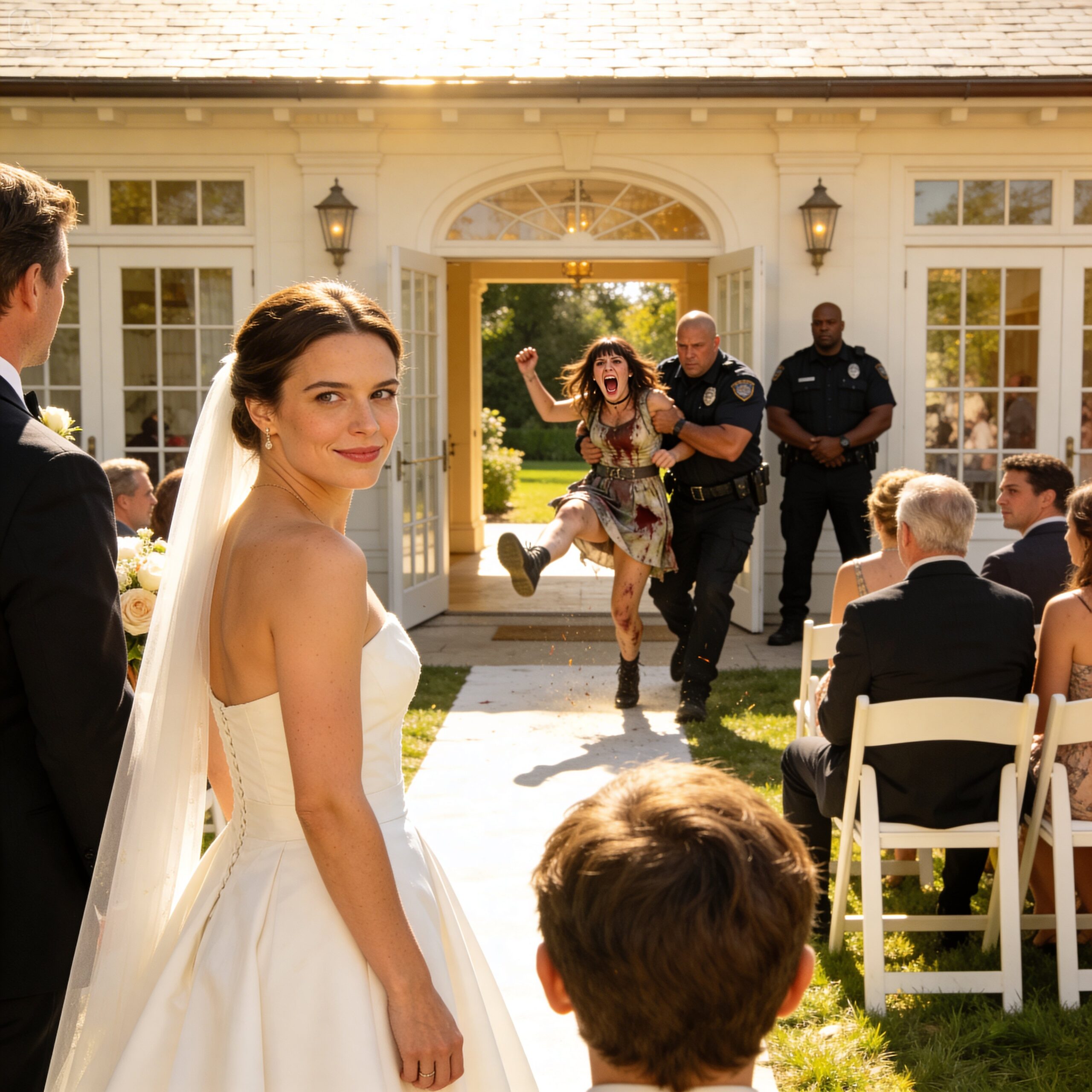 Just as Tom and I were exchanging our vows under a canopy of white roses, a loud commotion erupted near the entrance of the venue.