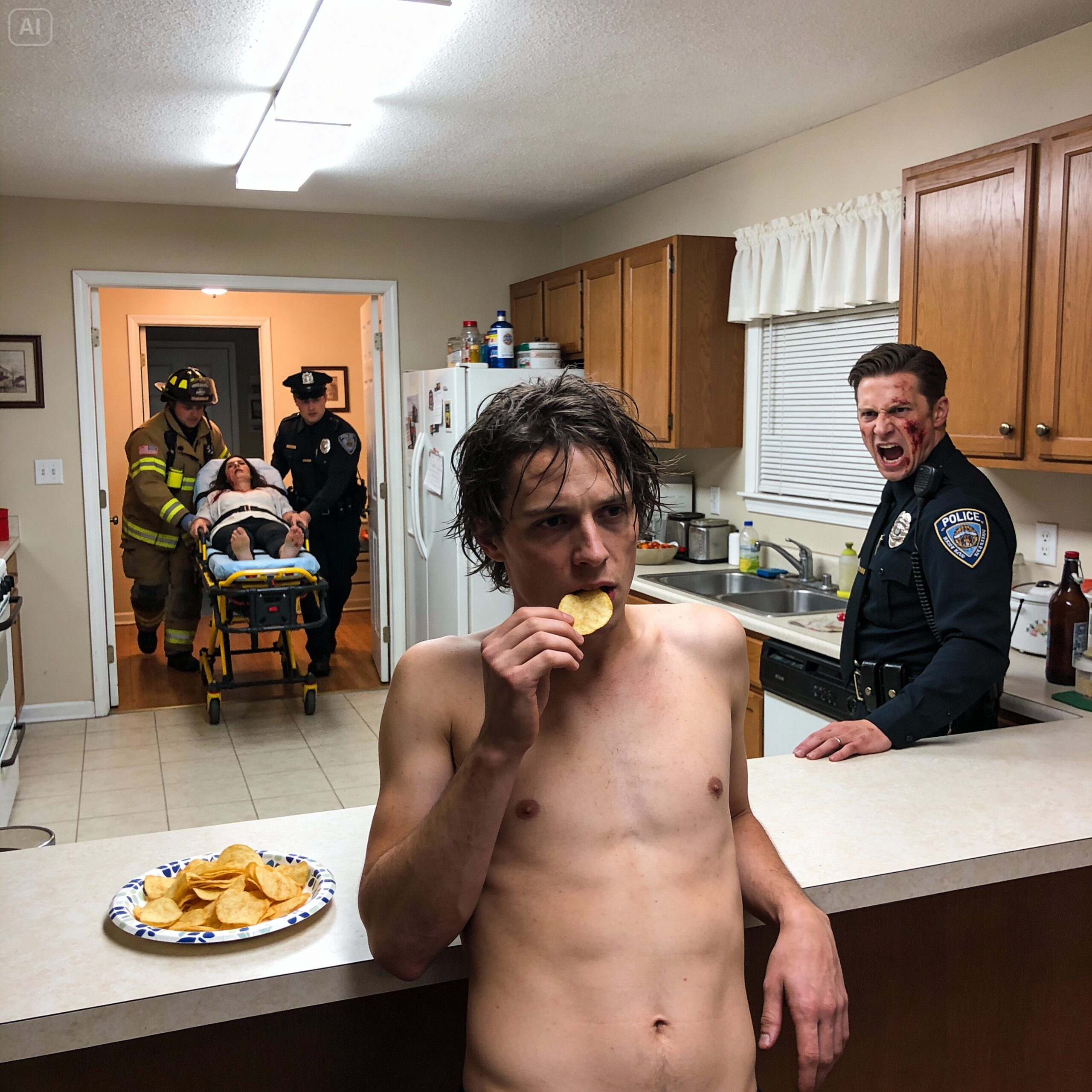 Suddenly, an officer walked in. He looked at me—shirtless, calm, casually eating a snack while my wife lay dying downstairs. The confusion in his eyes was instant. I could see the gears turning.