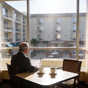 We walked into the lobby. The golden light hit us. He stopped in the center of the room, just standing there, gripping his walker. He looked around slowly—at the chandelier, at the fireplace, at the wingback chair where she used to sleep.