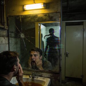 I started running. I bolted for the bathroom door, slammed it shut, and locked it. I leaned against the door, panting. The bathroom was filthy—fourteen years of grime. The mirror was cracked.